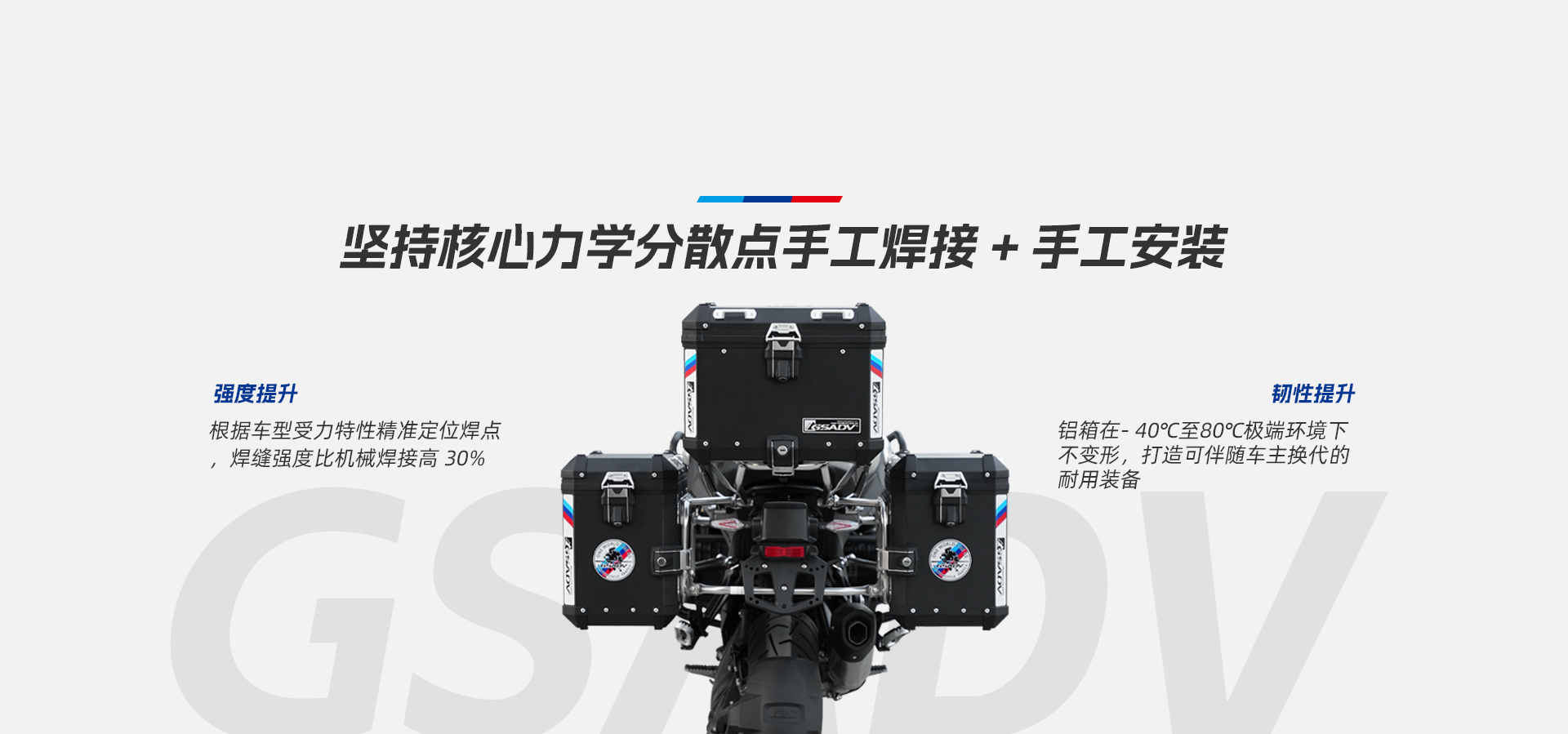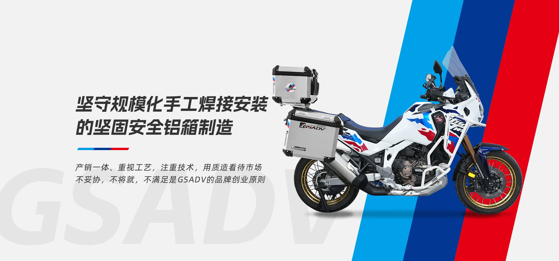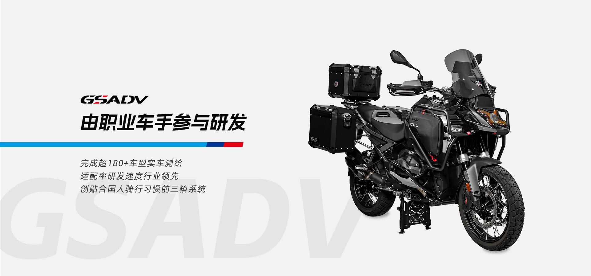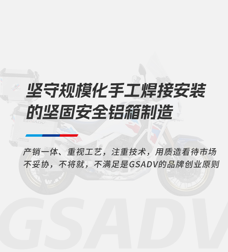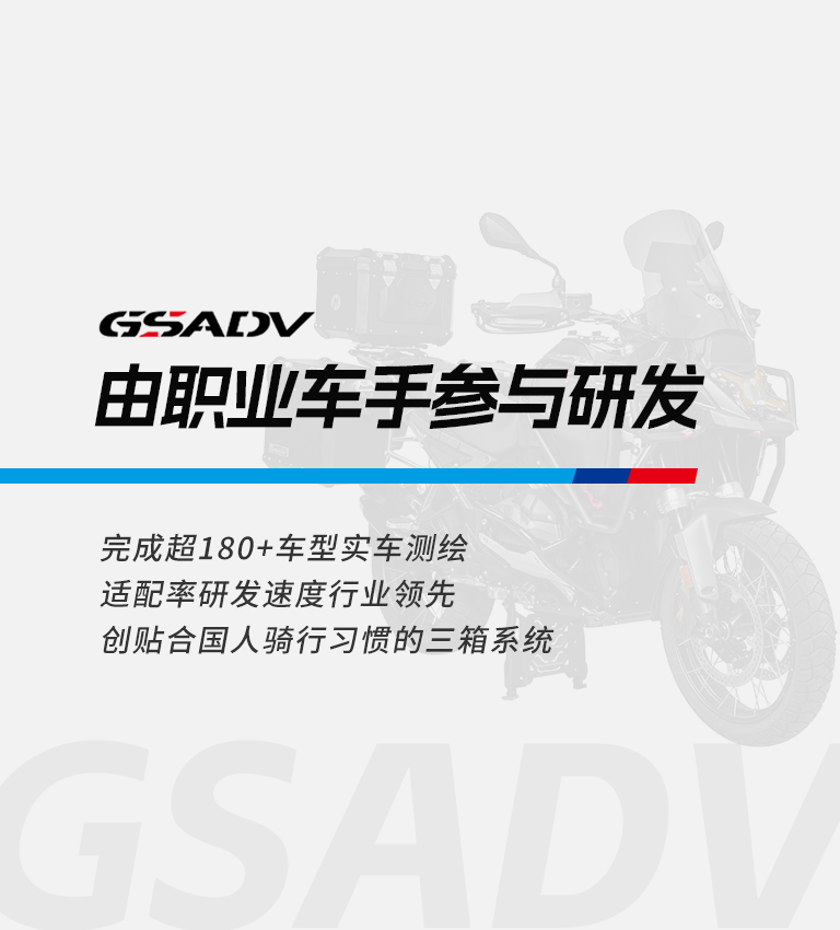 GSADV品牌创立于2010年,源于玩车团队对深度摩旅的热爱。在本地摩旅互助接待站服务中,对于深度自驾探险文化中自然见道,基于车手及职业玩家角度,做出不断超越自己、超越国际的“中国质造”更适合国人骑行三角设计的三箱贴合设计得到车手职业玩家认可。