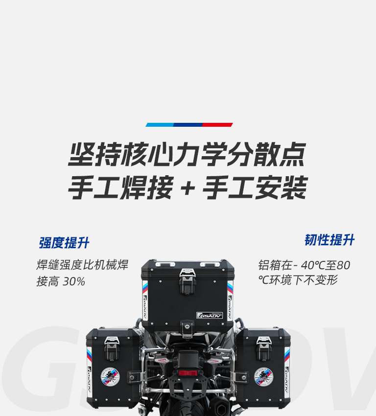 坚守本质规模化手工焊接、手工安装的坚固安全铝箱制造是GSADV的初心。产销一体、重视工艺,注重技术,用质造看待市场,不妥协,不将就,不满足是GSADV的品牌创业原则。在拥有全链数控一体化产链的制造实力下,国内仅存坚守规模化核心力学分散点进行手工焊接及手工安装的坚固铝箱制造型的品牌,更加坚定的投入到实现中国质造的事业中。